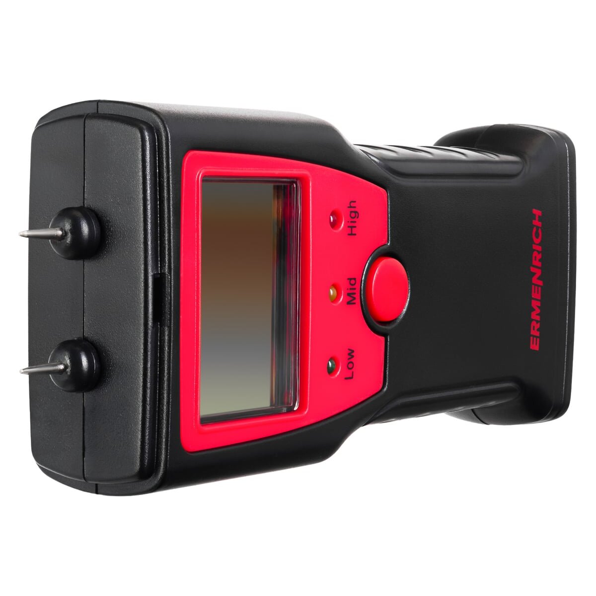 Датчик влажности (влагомер) Ermenrich Wett MW10 – портативный измерительный инструмент, который определяет уровень влажности разных материалов: в первую очередь сделанных из древесины, но также и предназначенных для строительных работ (растворов, смесей и проч.). Он работает по контактной технологии, т. е. имеет пару игольчатых сенсоров, которые и проводят замеры. Также прибор может определять температуру.
