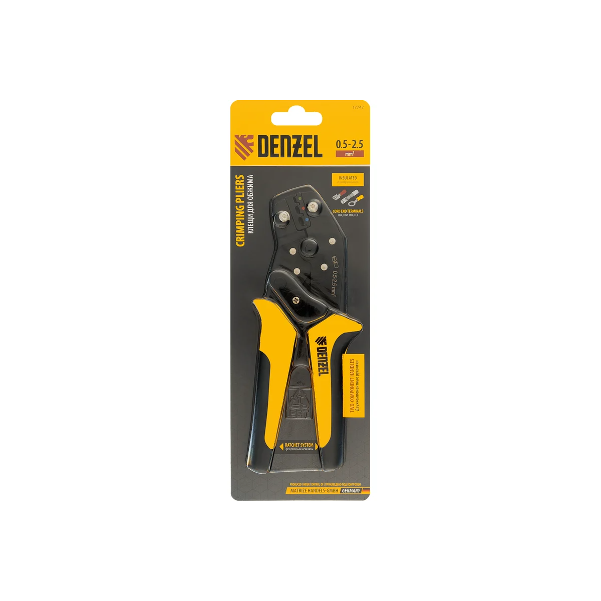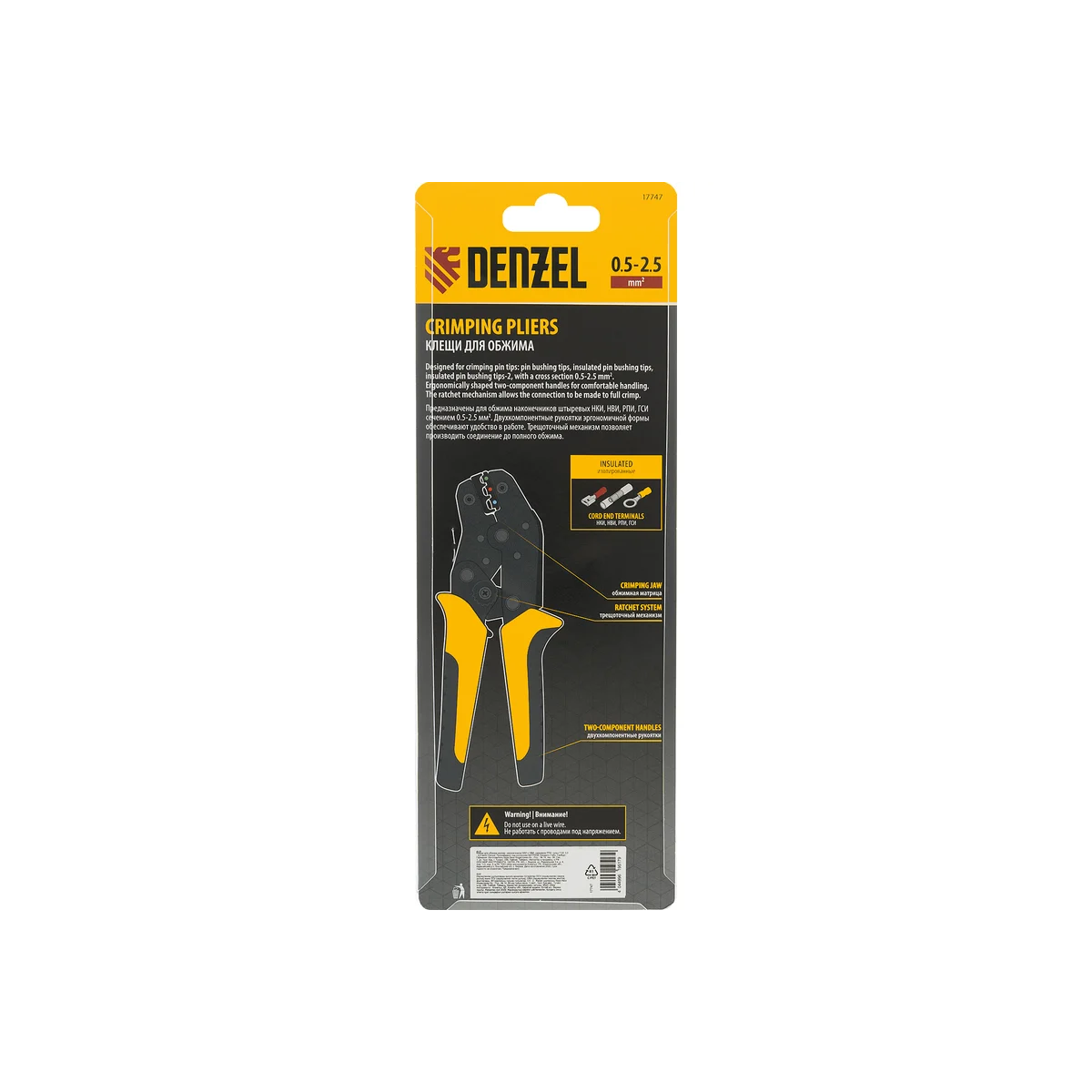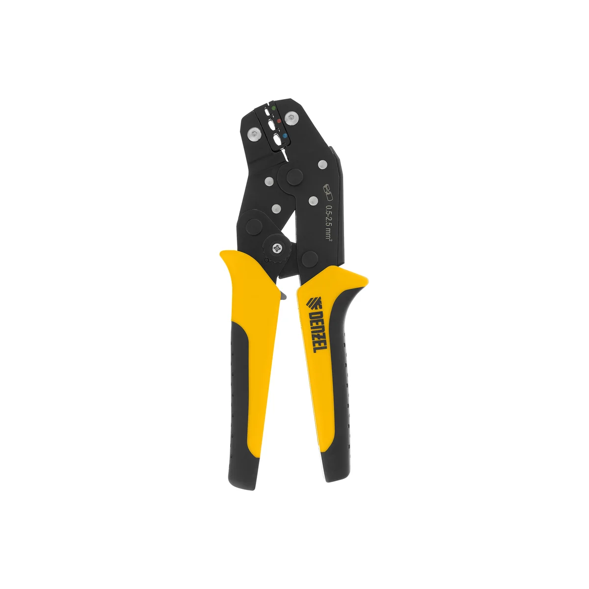 Клещи Denzel 17747 предназначены для обжима изолированных кольцевых наконечников НКИ и вилочных НВИ, разъемов плоских РПИ, гильз соединительных ГСИ сечением 0,5-2,5 мм². Инструмент пригодится частным и профессиональным мастерам при проведении электромонтажных работ.