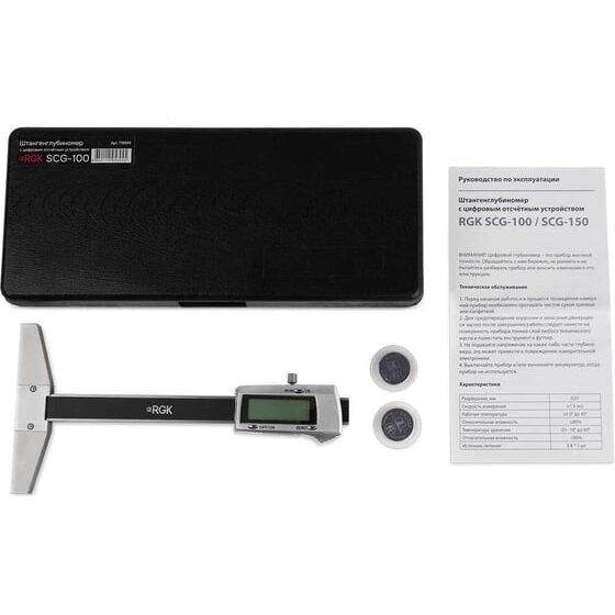Штангенглубиномер называется SCG-100, где SC означает - штангенциркуль, G - глубиномер, а 100 - это максимальное значение измерений в мм.Электронный штангенглубиномер RGK SCG-100, в отличие от измерительных устройств подобного типа со штангой прямоугольного сечения, позволяет определять глубину не только пазов, выемок, канавок и т.п., но и малоразмерных глухих отверстий с заглублением до 100 мм. В данном инструменте роль выдвижной штанги выполняет тонкий стальной стержень цилиндрической формы с плоской опорной поверхностью. Широкое основание при минимальном люфте подвижной части дает возможность также оценивать перпендикулярность конструкционных элементов обрабатываемой детали.Цифровое отсчетное устройство с дискретностью 0,01 работает в метрической и британско-американской системах мер, переключаемых нажатием одной кнопки, выдавая результаты в миллиметрах или дюймах. Для питания RGK SCG-100 используется 3-вольтовый элемент типа CR2032.Функция ZERO позволяет выставлять нулевое значение перед проведением замеров, благодаря чему истирание контактной поверхности выдвижной штанги при активной эксплуатации не вносит погрешность в получаемые результаты. Также данная функция дает возможность быстро определять разность глубин. Традиционно для штанген-инструментов, в штангенциркуле предусмотрен винтовой фиксатор, который служит для временного закрепления подвижной части измерителя относительно основания. Этим обеспечивается возможность комфортного снятия отсчетов при выполнении замеров в труднодоступных местах.Технические характеристики штангенглубиномера RGK 756945Шаг измерения0.01 ммТип нанесения разметкинетМах глубина измерения100 ммПогрешность40 мкмТолщинометрнет