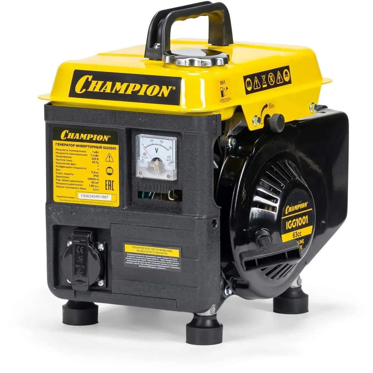 Мощность представленного генератора от бренда CHAMPION составляет 1.1 кВт.