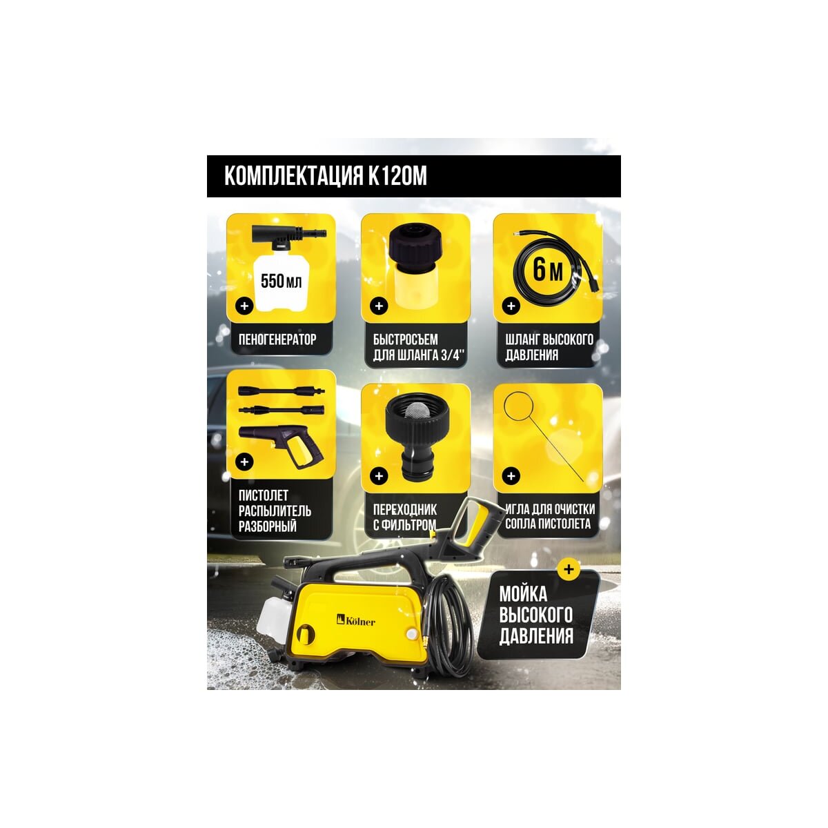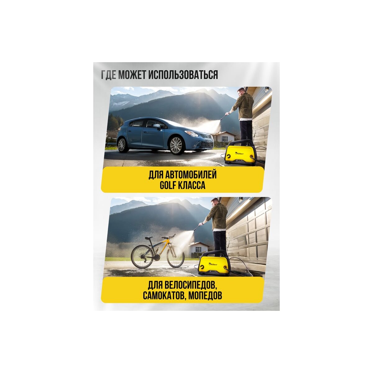 Мойка Kolner K120M подходит для очистки различных поверхностей: фасадов зданий, автомобилей, дорожек, заборов, садовой мебели и многого другого.