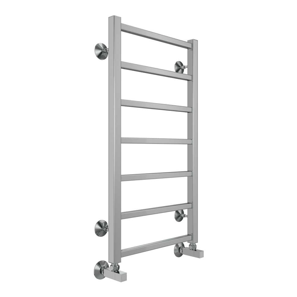 Модель водяного полотенцесушителя Terminus Контур относится к линейке в стиле хай-тек, тяготеющей к лаконичным формам и хромированным поверхностям, и отличается наличием дополнительной прогреваемой полки для хранения и сушки полотенец.