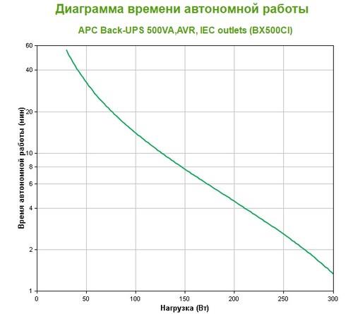 APC Back-UPS 500VA может выдерживать скачки напряжения от 160 до 280 В и частотные колебания – 45-65 Гц. Активная и полная выходная мощность – 300 Вт и 500 ВА соответственно. Тип сетей электропитания – однофазные. Наибольшая энергия импульса, которую способен поглотить ИБП в момент защиты подключенного устройства, – 273 Дж. Полная зарядка батареи происходит за 8 ч. После зарядки данная модель может работать при половинной нагрузке (50% от максимальной) до 1.3 минут. Светодиодный индикатор, находящийся на передней части корпуса, позволяет получить информацию о статусе устройства.