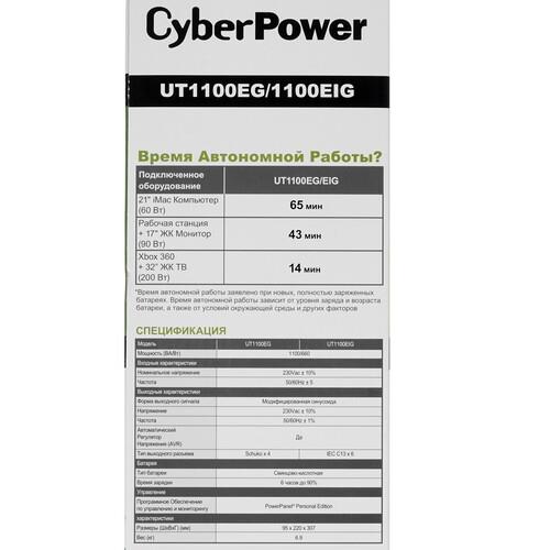 Особенность модели в конструкции GreenPower UPS Bypass, которая способствует снижению энергопотребления, что позволяет уменьшить рабочую температуру и сократить затраты. Выходная полная мощность соответствует 1100 ВА, а показатель эффективной мощности достигает 630 Вт. CyberPower UT1100EIG тратит 4 миллисекунды, чтобы переключиться на батарею, которая позволяет поддерживать работоспособность оборудования на протяжении 14 минут.