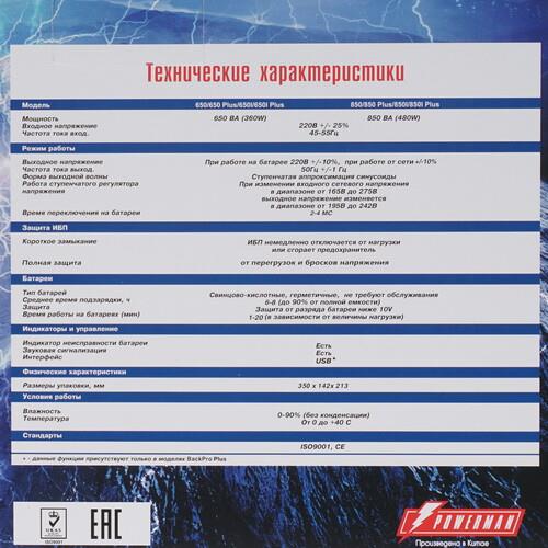 ИБП Powerman UPS BackPro 650Plus в традиционном черном цвете корпуса является линейно-интерактивным источником бесперебойного питания с модифицированной синусоидой в качестве формы напряжения. В оснащение этой модели входят две стандартные евророзетки, в которые подключается стационарный компьютер, монитор, коммуникационное оборудование или небольшой сервер. Устройство готово обеспечить пользователя несколькими драгоценными минутами для безопасного завершения работы на ПК после внезапного отключения электроэнергии.