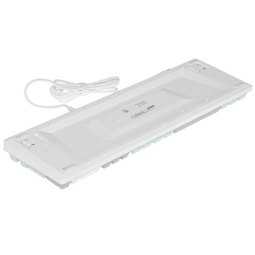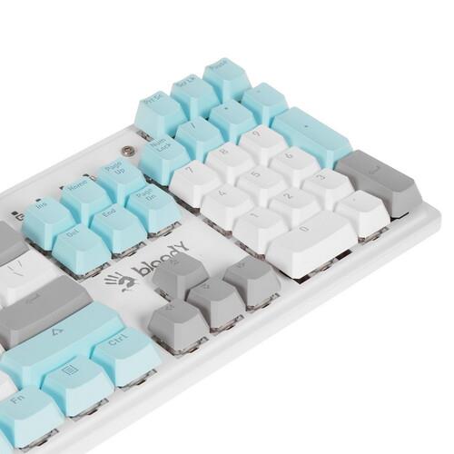 Полноразмерная проводная клавиатура A4Tech Bloody S515R имеет 104 клавиши с отдельным блоком цифр и линейкой Fn с различными функциями. Все клавиши разделены на 3 цвета по функциям: буквы и цифры белые, стрелки, пробел и некоторые другие – серые, а колонка Fn – голубая. Для удобства работы в темноте или при слабом искусственном освещении можно включить трехцветную RBG-подсветку.