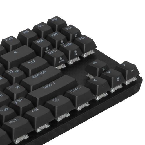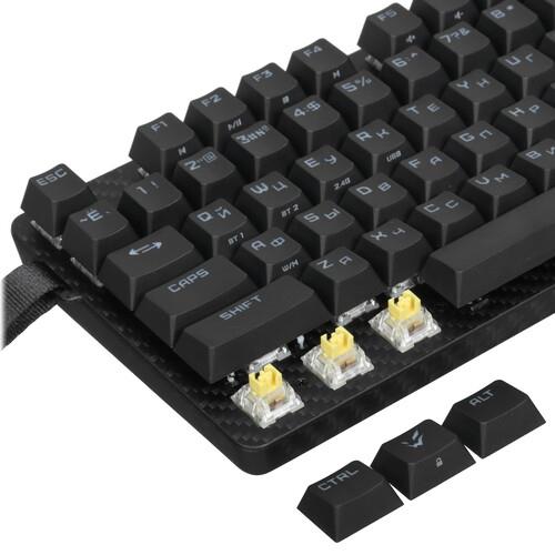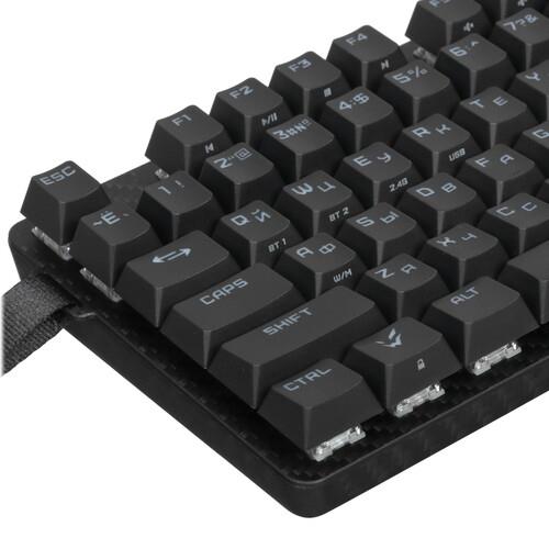 Клавиатура проводная + беспроводная ARDOR GAMING Carbon [AG-DD-87KTB-HS-B] получила 87 механических клавиш с линейными переключателями Kailh turbo-Yellow. Они обеспечивают плавный ход, распознают команды даже при незначительном нажатии. На раскладке есть программируемые клавиши. Их можно настроить на вывод определенных приложений, браузера, других действий. RGB подсветка позволяет настраивать разные сценарии свечения.