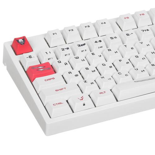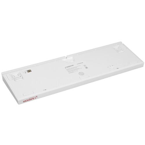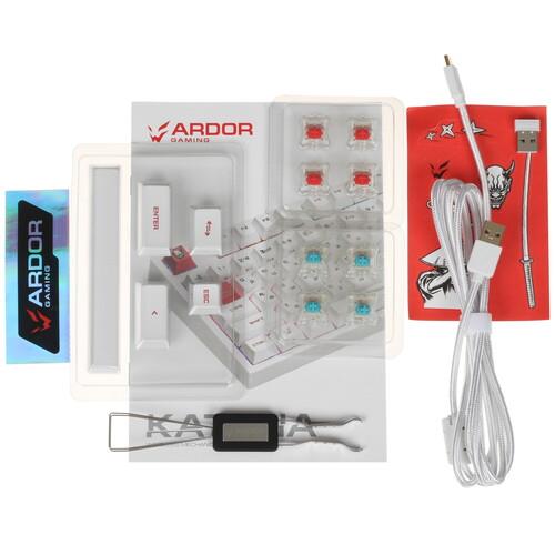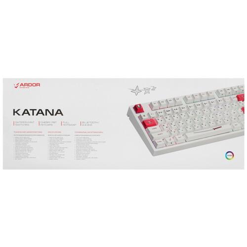 ARDOR GAMING Katana предусматривает 3 варианта подключения: на радиоканальной частоте 2.4 ГГц, по беспроводной технологии Bluetooth и через кабель USB. Система Hot Swap позволяет заменять переключатели. В автономном режиме клавиатура работает от встроенного аккумулятора. В комплекте поставляются сменные свитчи, кейкапы и тематические стикеры.