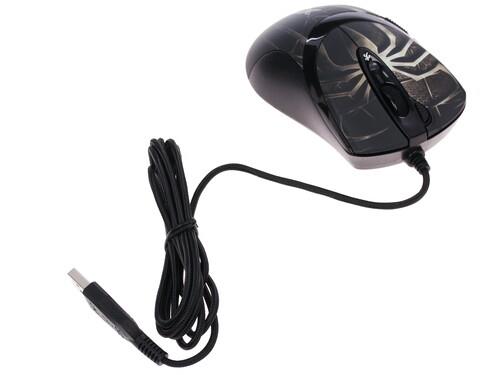 Проводная мышь A4Tech XL-747H – игровой компьютерный манипулятор с изображением на верхней панели паука, который добавляет внешнему облику устройства брутальности. С боков под опорные пальцы имеются рельефные вставки из прорезиненного материала. Поверхность имеет эластичную матовую текстуру, благодаря чему ладонь не липнет и не испытывает дискомфорт.