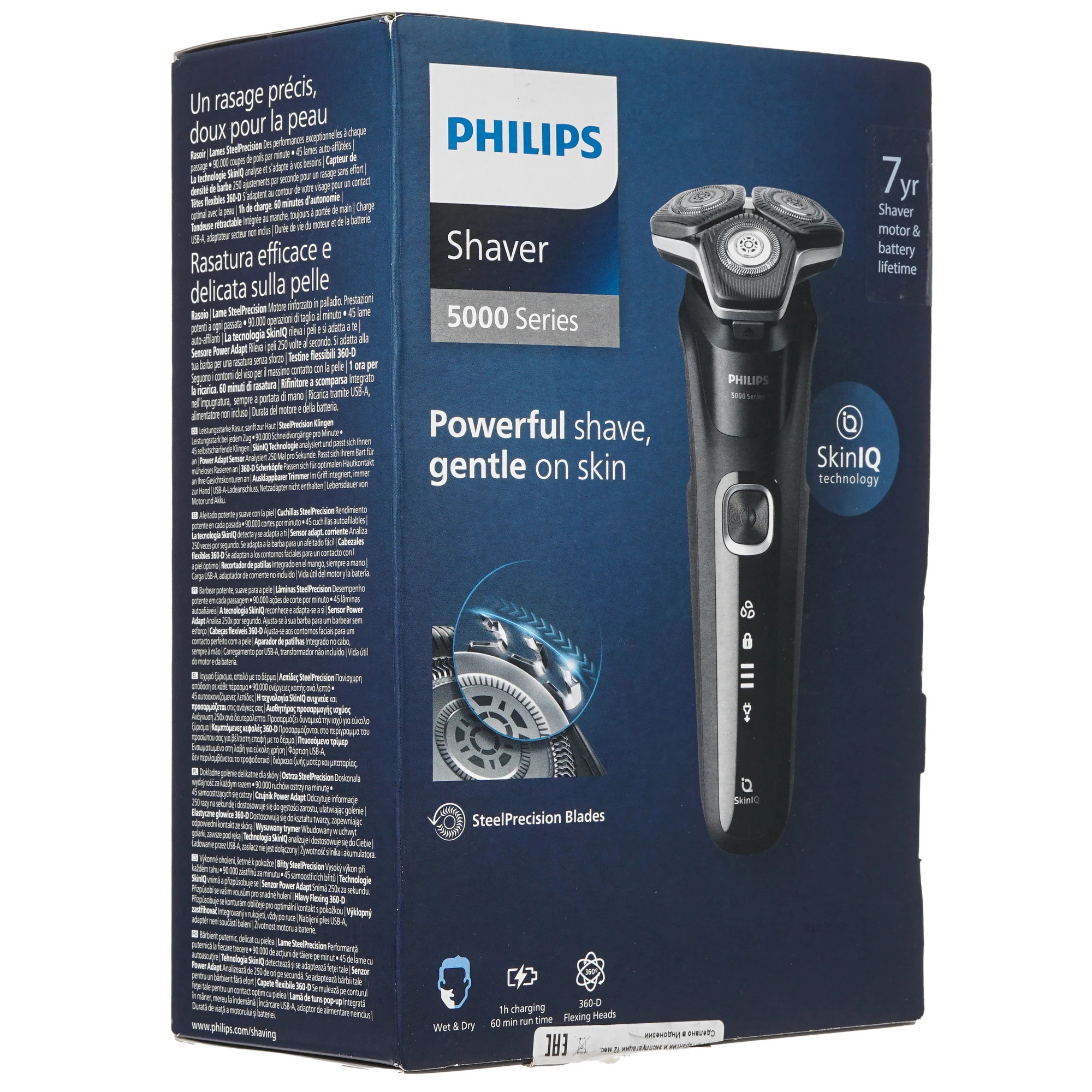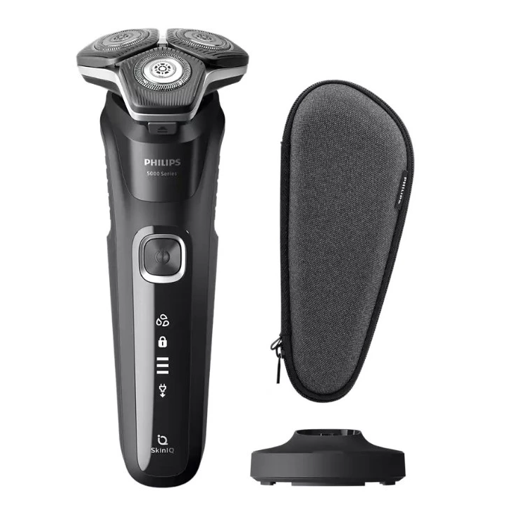 Электробритва Philips S5898/35 роторного типа подходит для сухого и влажного бритья. К 3 секциям прилагаются плавающие головки, повторяющие контуры лица в процессе. Это означает, что создать подходящие условия для бритья можно даже для чувствительной кожи. В этом также помогает технология SkinIQ, анализирующая особенности лица владельца и подбирающая к нему оптимальные условия. Например, она распознает тип щетины и ее густоту. Устройство может работать от аккумулятора до 1 ч при условии полной зарядки. Его можно брать с собой – для безопасности у него есть функция блокировки кнопок и дорожный чехол. Дополнительно предусмотрена возможность использовать Philips S5898/35 в качестве триммера.