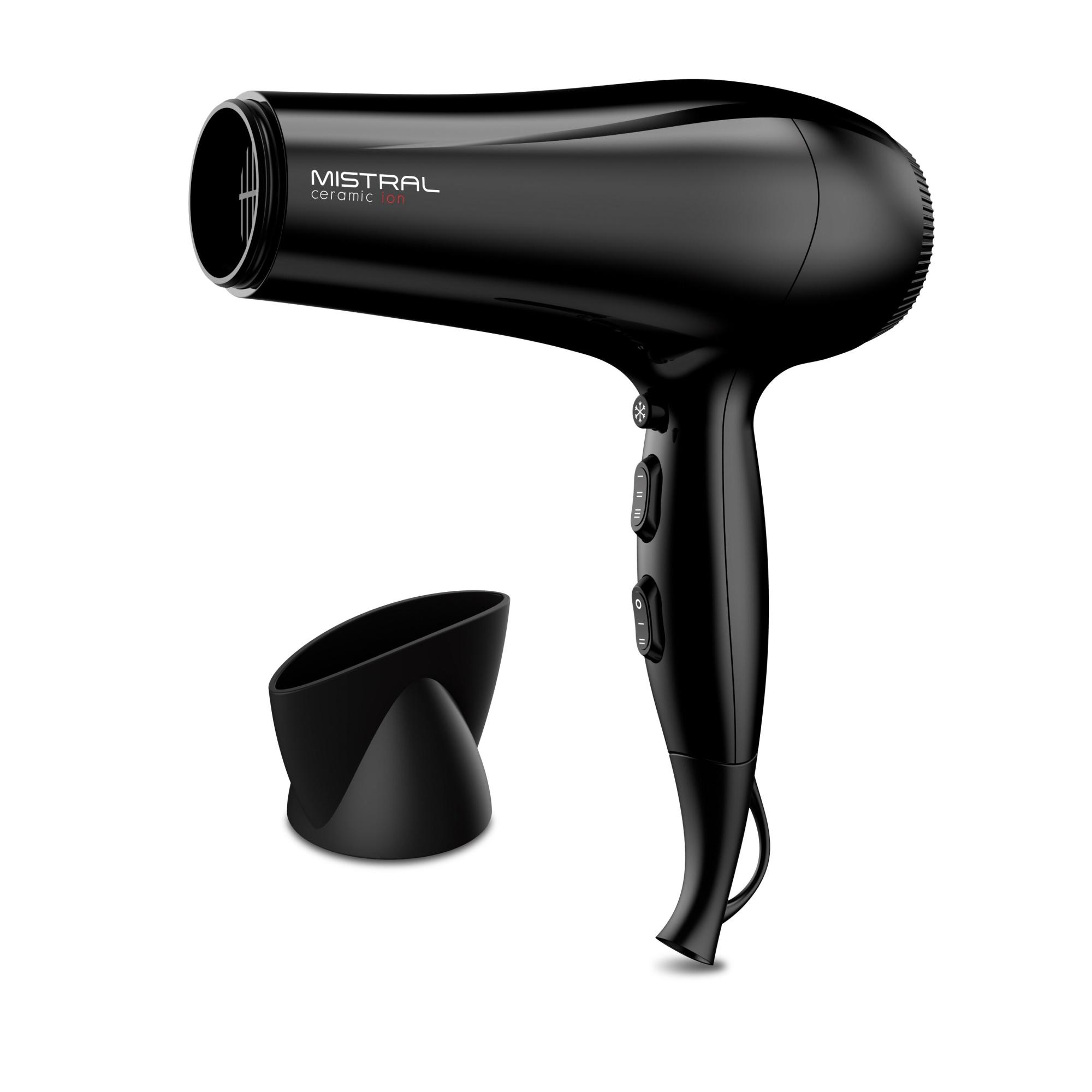 Легкий фен для волос Mistral Ceramic Ion с мощностью 2200 Вт и DC мотором выполнен в классическом черном цвете. Кнопки управления расположены на рукоятке, фен удобно лежит в руке, имеет небольшой вес всего 405 грамм. У него 6 режимов работы: 3 температуры и 2 скорости, а также функция холодного обдува, которая помогает закрепить укладку. В комплект входит одна насадка-концентратор шириной 8 см для сушки и укладки на брашинг.