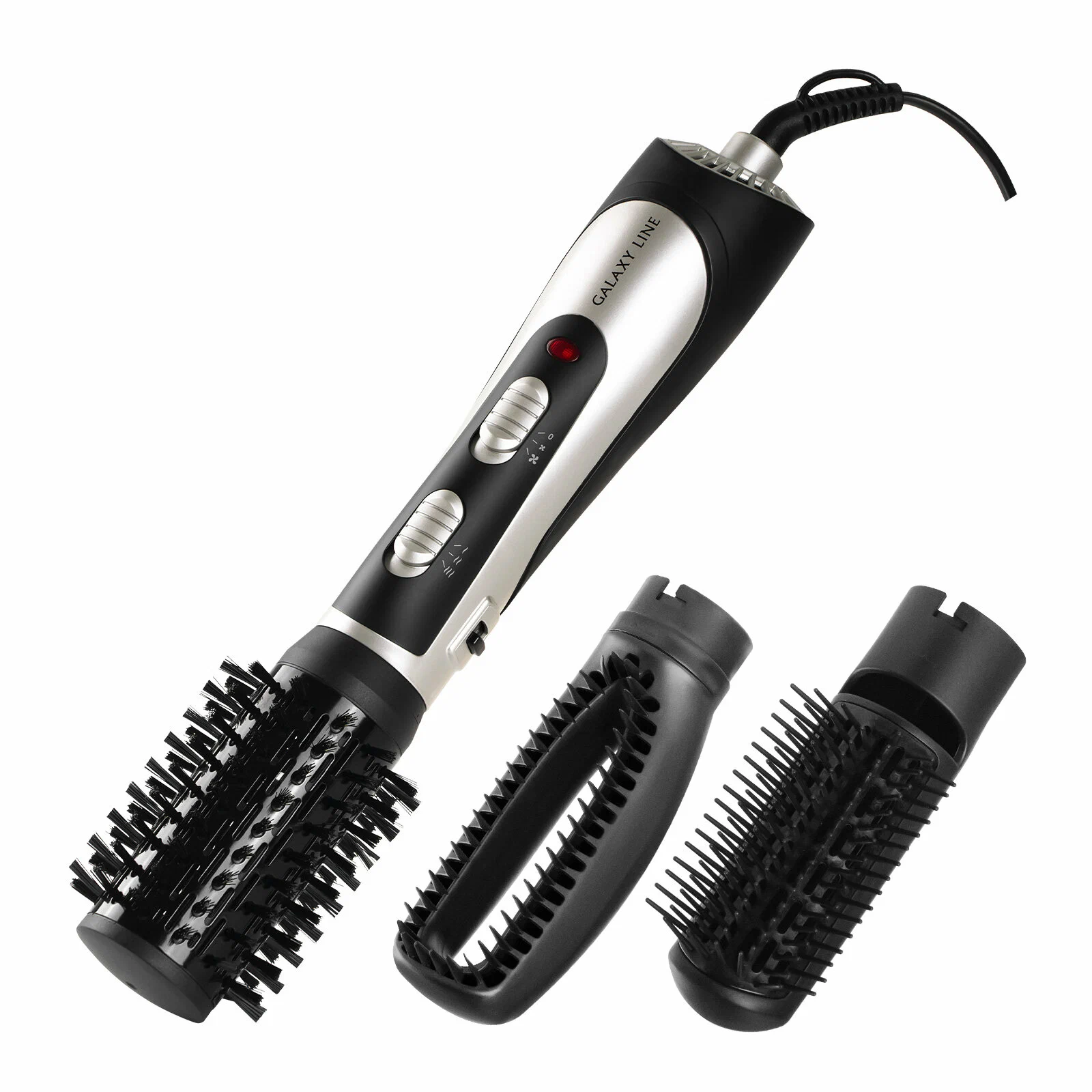Насадка круглая со щетиной предназначена для закручивания локонов внутрь/наружу и придания объема у корней. Полая насадка-расческа предназначена для сушки волос. Полукруглая насадка-щетка предназначена для одновременной сушки и расчесывания волос.