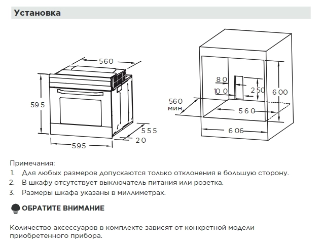 Габариты ниши для встраивания (ВШГ): 560570600 мм.