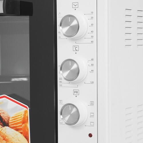 Таймер обратного отсчета позволяет установить определенное время приготовления до 90 минут. Звуковой сигнал оповещает о завершении времени, после чего электропечь отключается автоматически. Прозрачное стекло на дверце и подсветка помогают контролировать степень готовности блюда. В наборе с Simfer M7001 поставляются круглый противень, стандартный противень, вертел и решетка.