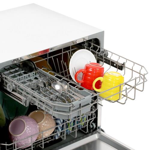 Посудомоечная машина Hyundai DT505 белого цвета имеет интуитивно понятную панель на верхней части корпуса. Для удобства предусмотрен дисплей и индикатор наличия соли и ополаскивателя. Для эффективной очистки предусмотрено шесть программ, которые отличаются температурой нагрева и временем работы.