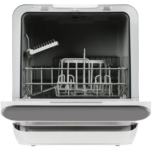 Посудомоечная машина MAUNFELD MWF07IM – компактная модель, которая предусматривает возможность автономной работы без необходимости подключения к централизованной водопроводной сети благодаря встроенному резервуару. Отвод использованной воды из посудомоечной машины осуществляется с помощью шланга. Данная модель характеризуется вместимостью 3 комплектов посуды и расходует за один цикл 6 л воды.