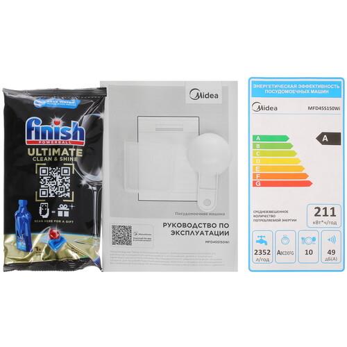 В конструкции посудомоечной машины Midea MFD45S150Wi есть ионообменник, который смягчает воду. Таймер отложенного старта на 12 часов предполагает программирование нужного времени включения. Виртуальный ассистент Алиса обеспечивает простое управление параметрами с помощью голосовых команд. Приложение SmartHome предлагает дистанционную настройку техники с мобильного устройства. Соответствие классу A++ гарантирует экономичное потребление энергии.