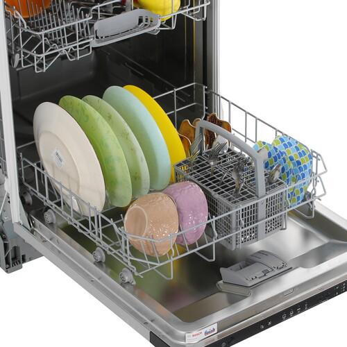 Благодаря 2 корзинам, отдельным лоткам для столовых приборов, бокалов и чашек встраиваемая посудомоечная машина Bosch SMV24AX02E вмещает 12 комплектов посуды. Инверторный мотор с мощным насосом усиливает циркуляцию воды при расходе за цикл не более 11.7 л. Луч на полу выполняет функцию рабочего индикатора, отображает оставшееся время до конца программы.