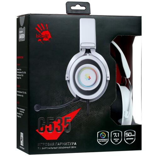 Проводная гарнитура A4Tech Bloody G535 белого цвета с черными вставками изготовлена из высококачественных и долговечных материалов, устойчивых к истиранию. Для комфортного общения во время игр есть микрофон высокой чувствительности на подвижном креплении. Провод в тканевой оплетке длиной 2 м подключается к компьютеру или другим устройствам через USB-разъем. Для комфортного и быстрого переключения на корпусе есть регулятор громкости, включения подсветки и объемного звука.