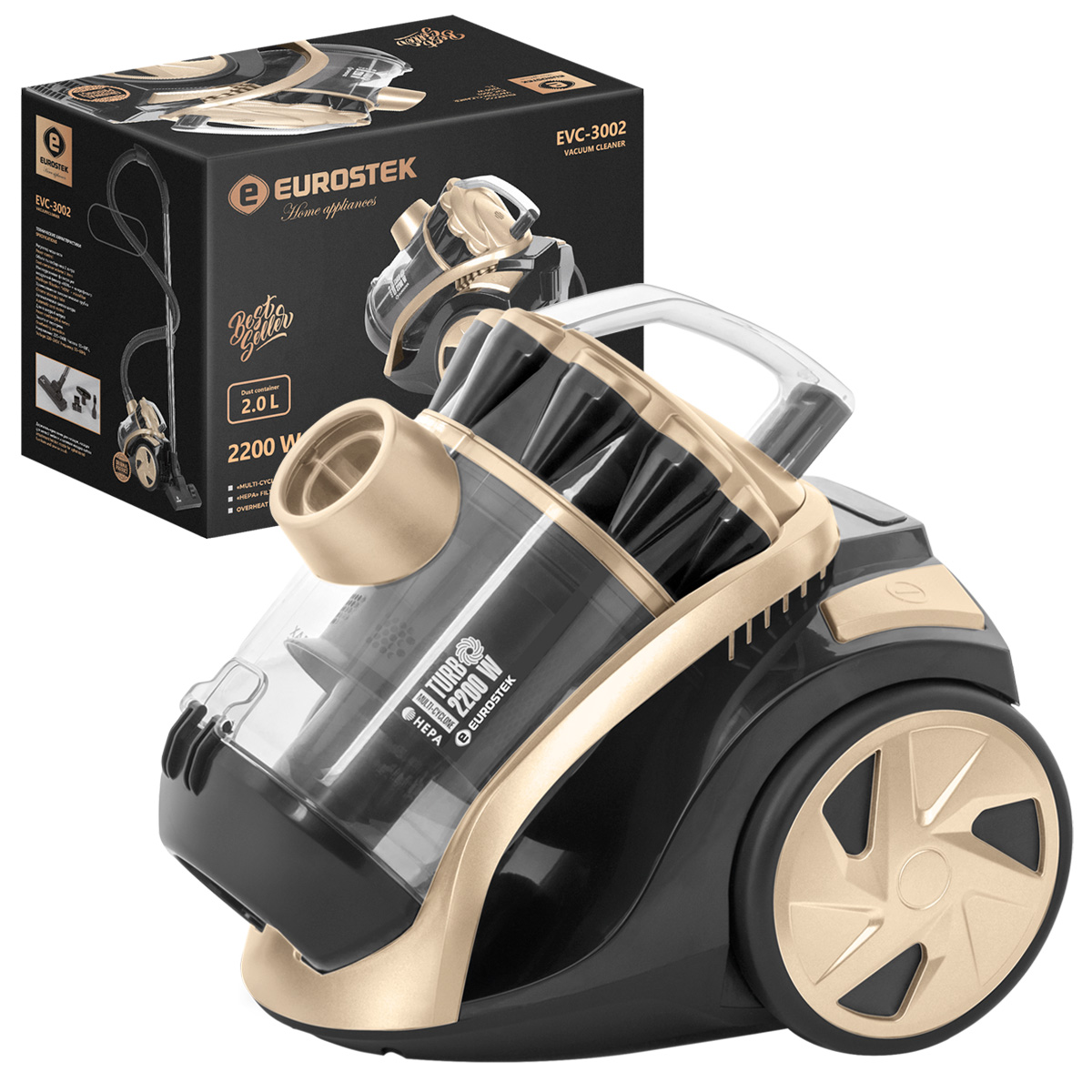 Пылесос МУЛЬТИ-Циклон Eurostek EVC-3002. Многоступенчатая система фильтрации. Внутренний ХЕПА фильтр, внешний ХЕПА фильтр. Максимальная мощность 2200 Вт., мощность всасывания 400 Вт., телескопическая металлическая трубка 80 см, щетка для пола 2 в 1: пол/ковер, щелевая насадка-щетка в комплекте, объем пылесборника 2 литра, индикатор заполнения пылесборника, длина шланга 150 см, длина шнура 4 м, защита от перегрева, автоматическая смотка шнура
