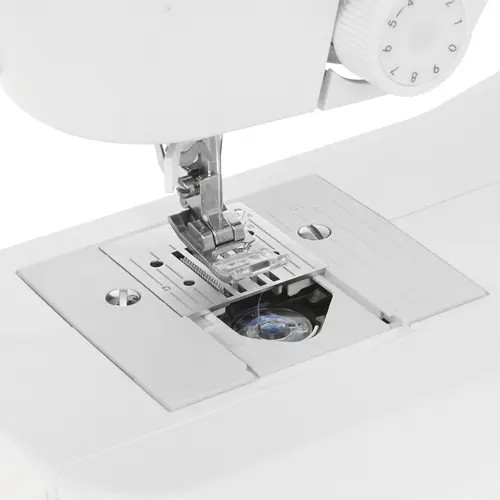 Оборудование представлено в настольном белом корпусе с дисплеем, рукавной платформой, отсеком для аксессуаров и горизонтальным челноком. Устройство работает от стандартной электросети, а поставляется с набором шпулек, лапок и игл, отверткой, масленкой, распарывателем и пластиной для штопки/вышивки. Прибор весит 5.5 кг и обладает размерами 37.8x30.8x14 см.