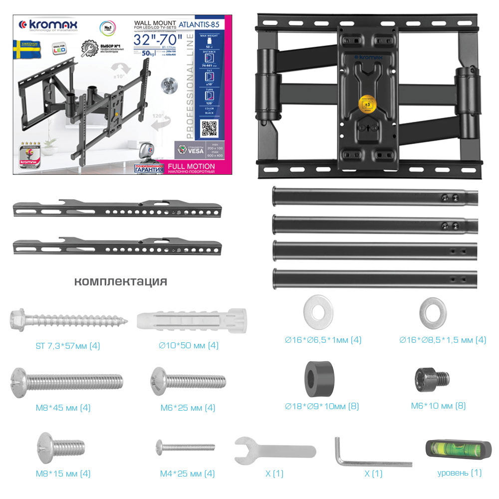 KROMAX ATLANTIS-85 BLACK надёжно удержит экран размером 32"-70" дюйма и весом 50 кг. Простая конструкция KROMAX ATLANTIS-85 BLACK идеально подойдет для самостоятельного монтажа. Наклонно-поворотная регулировка позволит наклонять вверх и вниз на ±10°, поворачивать влево и вправо на 120°, и выдвигать на 74-441 мм.