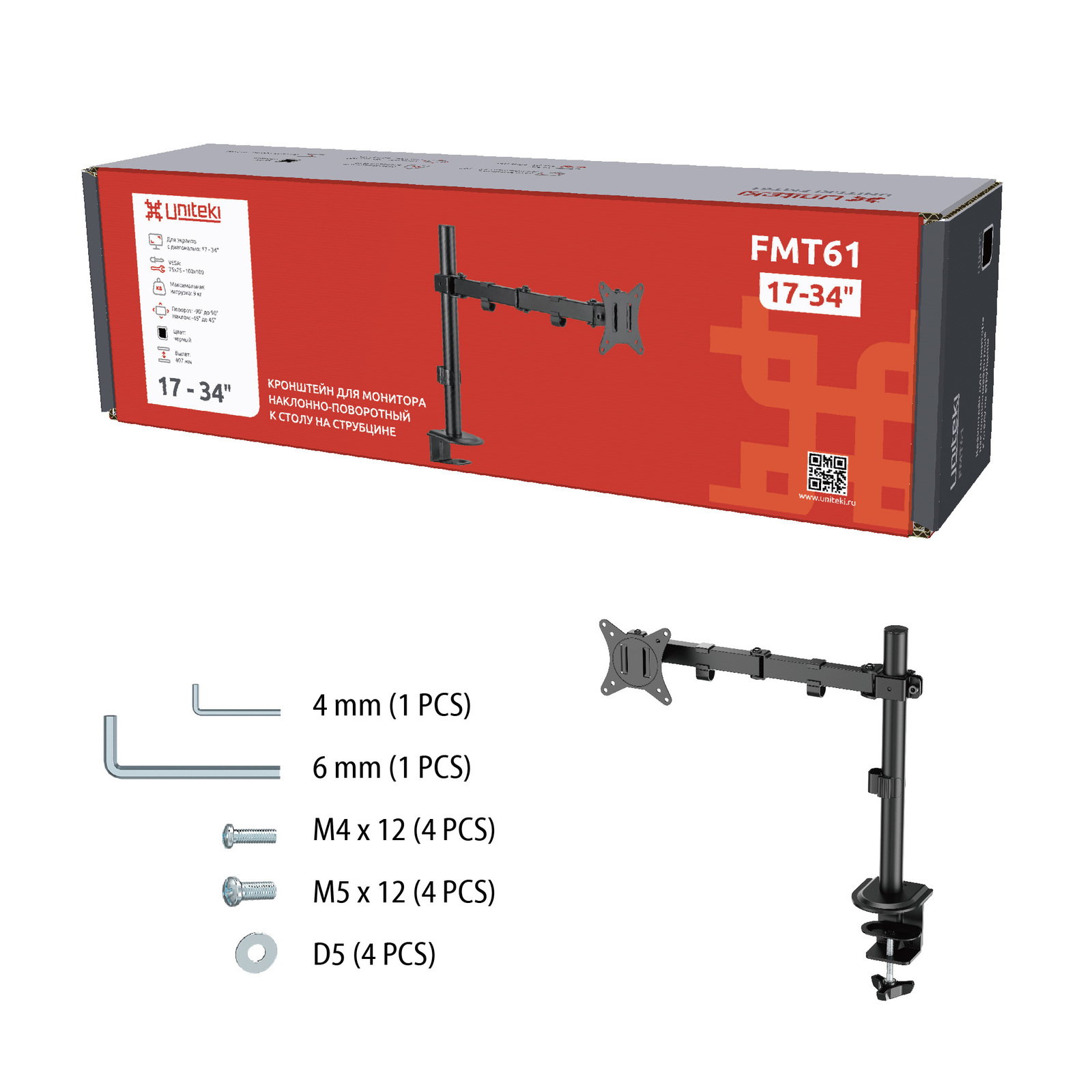 Кронштейн UNITEKI FMT61 подходит для всех мониторов, диагональю от 17 до 34 дюймов (см.: 43 ~ 86,36) и весом до 9 кг.