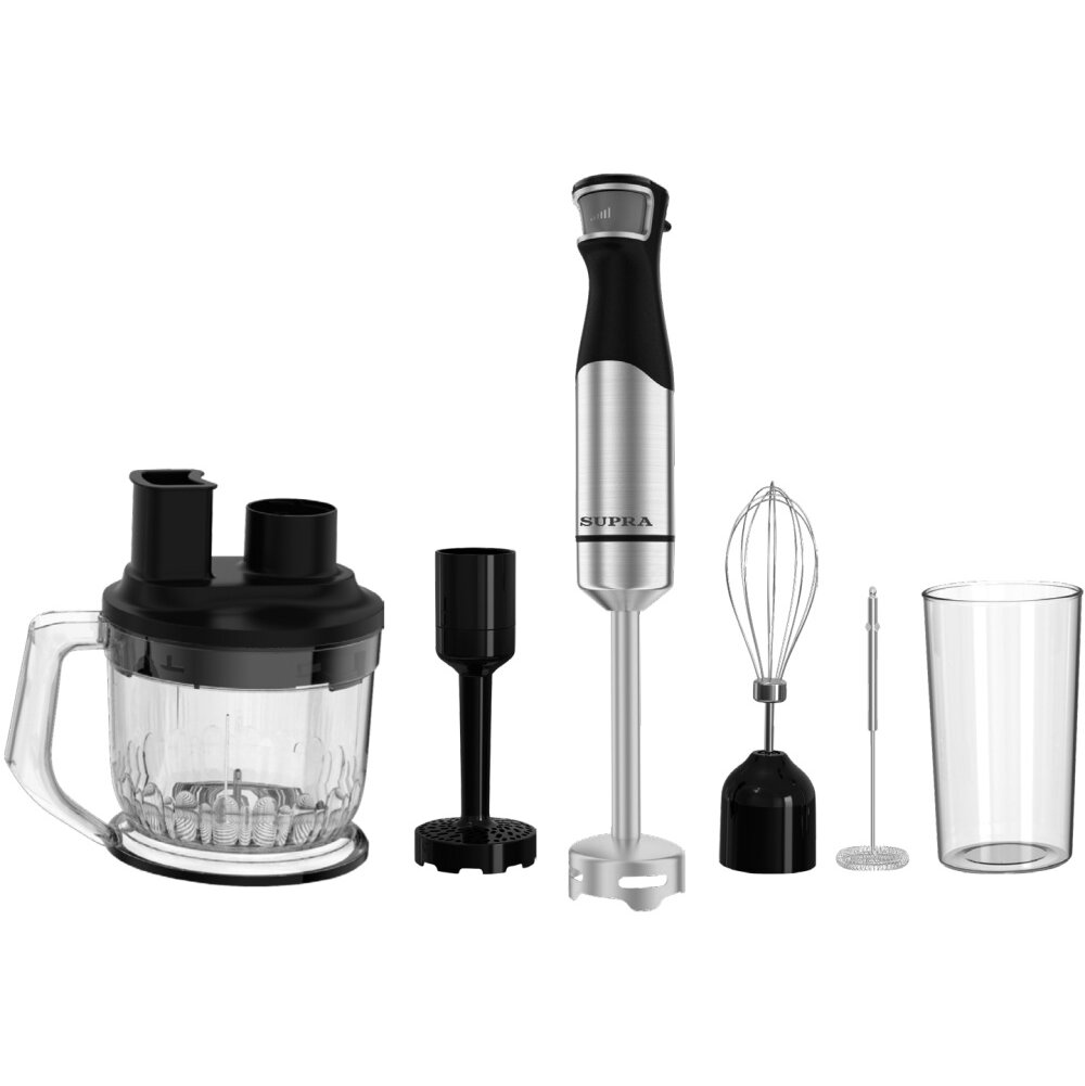 Особенностью SUPRA HBS-1212 является бесступенчатое управление одной кнопкой, что обеспечивает удобство использования и позволяет плавно регулировать скорость работы. Устройство питается от сети, имеет длину шнура 1 метр и поддерживает все необходимые функции для ежедневного использования на кухне