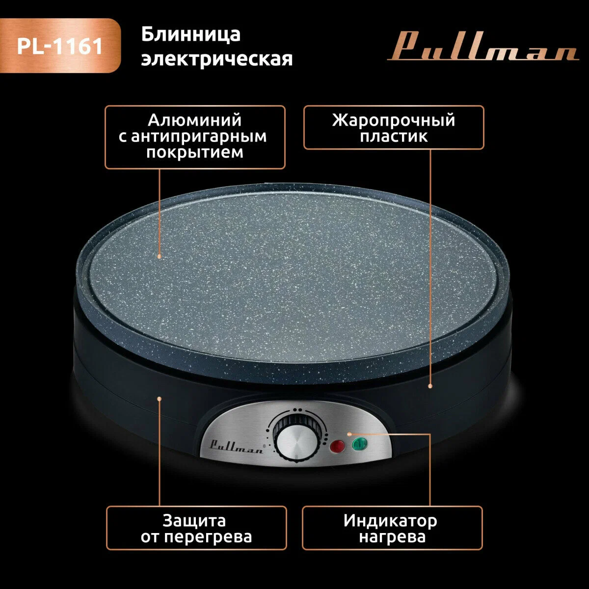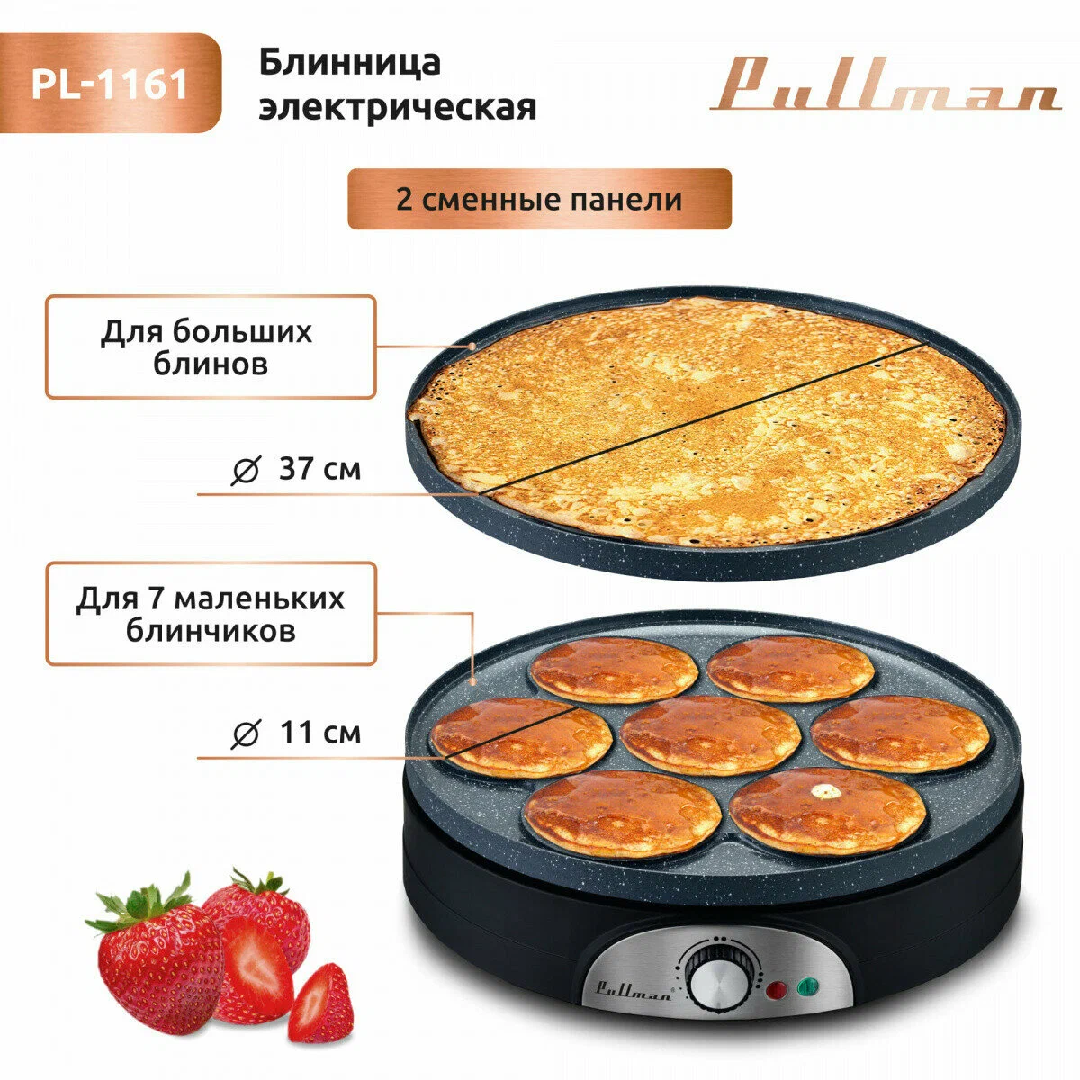 БрендPullmanЦветчeрныйВид блинницыБлинницаМаксимальное количество блинов7Мощность1500 ВтРазмер блинов (на основной плитке)37 смМатериал корпусаКерамикаСменная плиткаестьОсобенностиКомплектациялопатка для блинов (1 в комплекте)Габариты (ВхШхД)10x37x39 смВес2.7 кгДополнительная информациякерамическое антипригарное покрытие; в комплекте: пластиковые шпатель, лопатка; индикатор нагрева и сети, регулировка температуры; длина кабеля 75 см