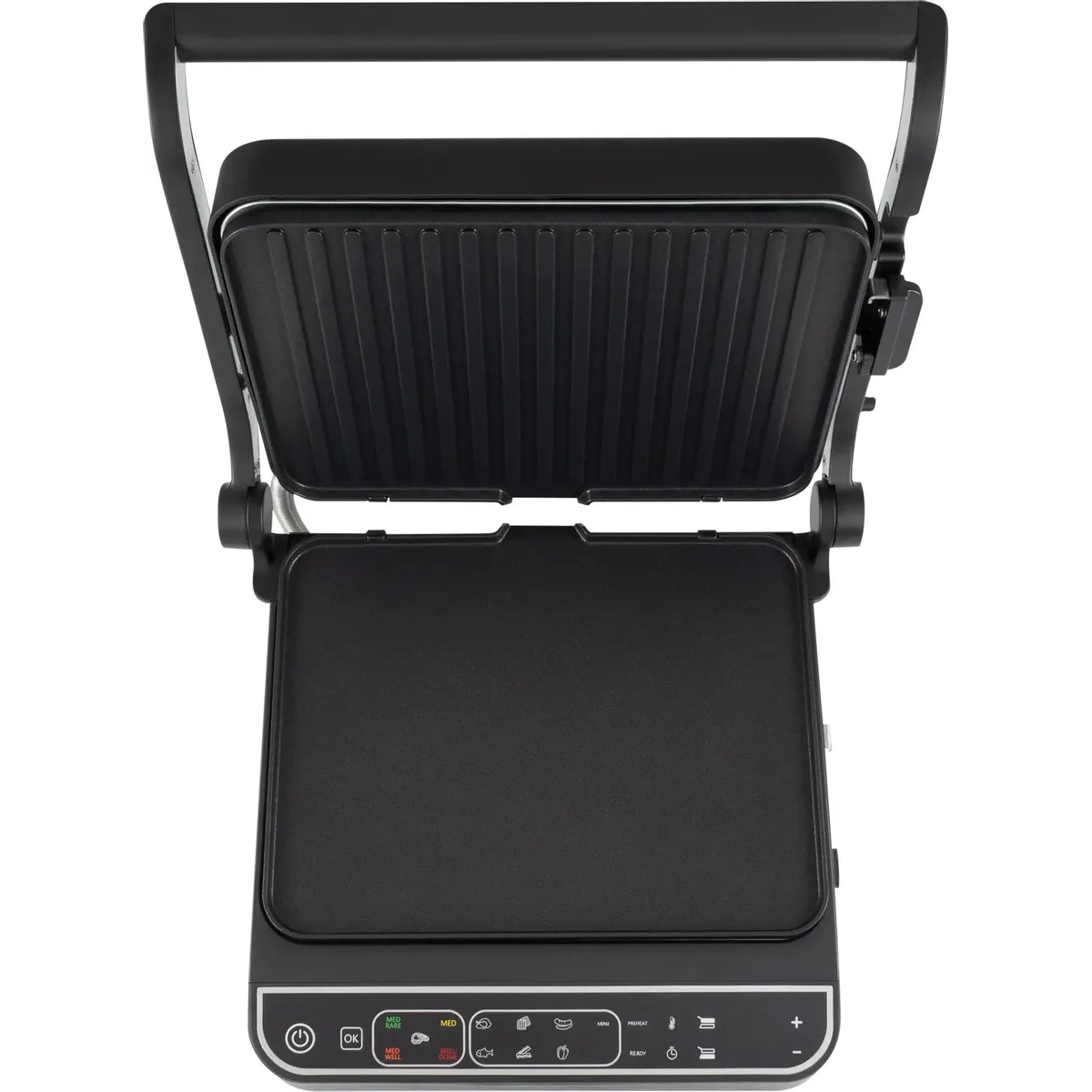 Термощуп обеспечивает автоматический контроль температуры внутри стейка, тем самым контролирует степень прожарки. 10 автоматических программ для приготовления, а так же ручной режим, для оптимальных настроек для каждого типа продуктов. Открытие на 180°, плоская панель и раздельная регулировка температуры панелей, позволяет использовать гриль как плиту.