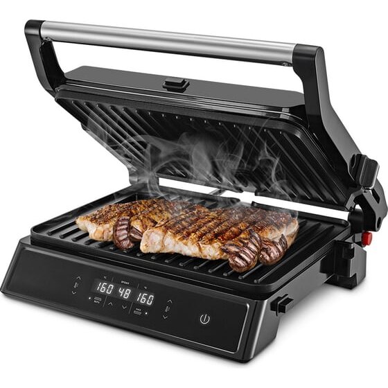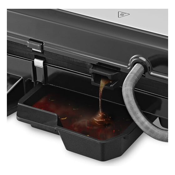 Конструкция гриля позволяет готовить в трех режимах: двустороннем, одностороннем и с приоткрытой крышкой. В двустороннем режиме гриль закрывается крышкой, благодаря чему продукты находятся между двух нагреваемых панелей и готовятся с двух сторон. В режиме приготовления с приоткрытой крышкой верхняя нагреваемая панель опускается не до конца, что полезно при готовке продуктов, которые могут потерять форму из-за давления крышки. В одностороннем режиме крышка гриля откидывается на 180°, благодаря чему гриль превращается в большую жаровню, а продукты можно выложить сразу на две панели. Данная модель оснащена поддоном для слива жира и сока, которые выделяются в процессе приготовления продуктов.