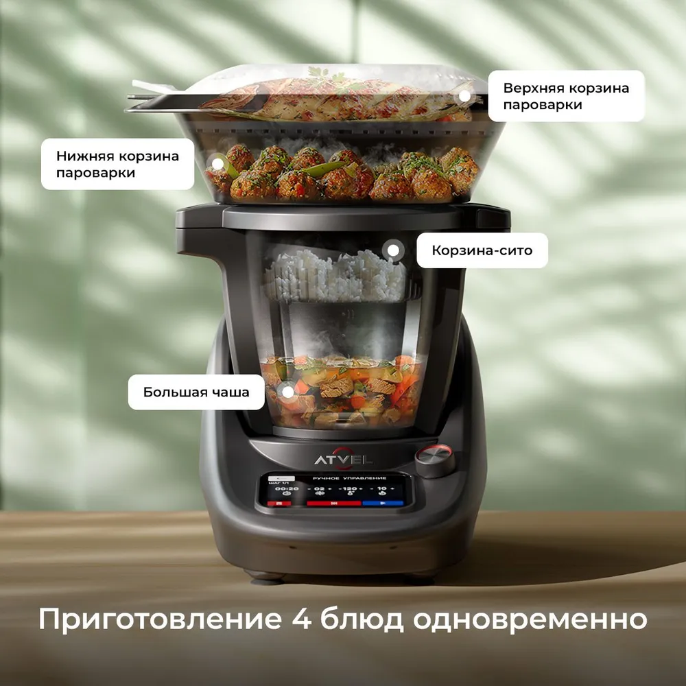 Программы приготовления: Варка, Поддержание тепла, Тушение, Разогрев, Подогрев, Йогурт, Суп, Приготовление на пару, Каша