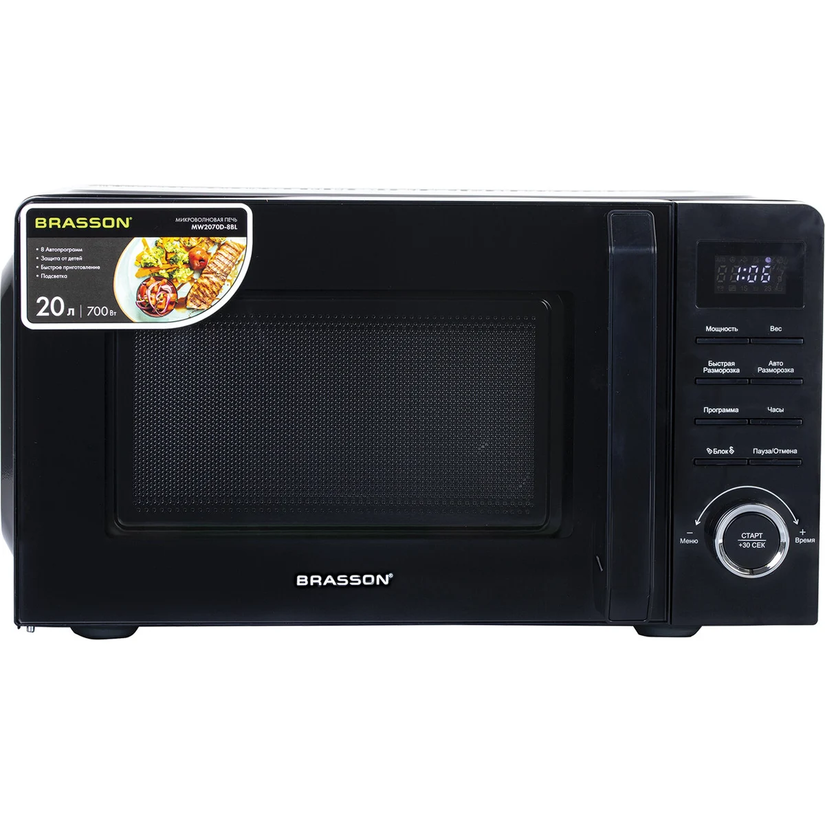 Микроволновая печь BRASSON MW2070D-8BL – компактная и мощная микроволновка черная объемом 20 литров и мощностью 700 Вт, которая станет незаменимой техникой для кухни дома и в офисе.