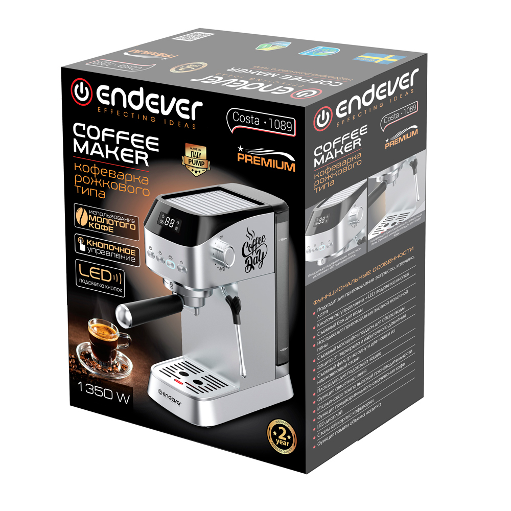 Тип кофеварки: рожковый, Тип используемого кофе: молотый, Подходит для приготовление эспрессо и капучино, Кнопочное управление + LED подсветка кнопок, Съемный бак для воды, Стимер для приготовления плотной молочной пены, Съемный моющийся поддон для сбора воды, Защита от перегрева и избыточного давления, Съемный фильтр на одну и две чашки из нержавеющей стали, Функция автоотключения, Площадка для подогрева чашек, Итальянская помпа высокой производительности, Функция предварительного смачивания кофе, LED дисплей, Стальной корпус кофеварки, Функция памяти объема напитка