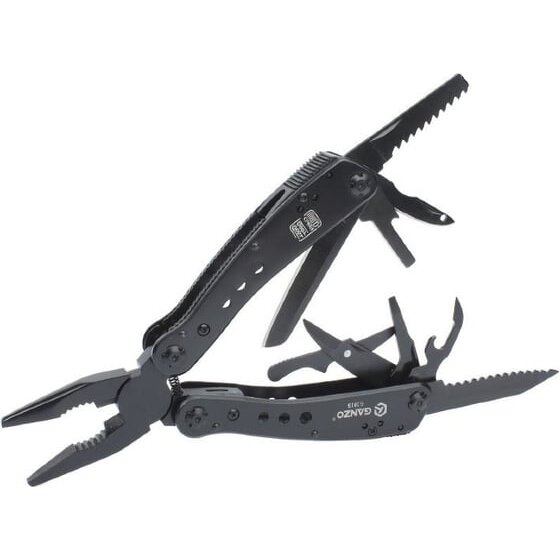 плоскогубцы, кусачки, лезвие с прямой заточкой, серрейтор, пила, плоская отвертка, шило, инструмент для зачистки проводов, открывалка, ножницы, держатель для бит